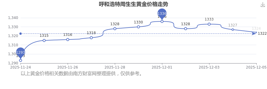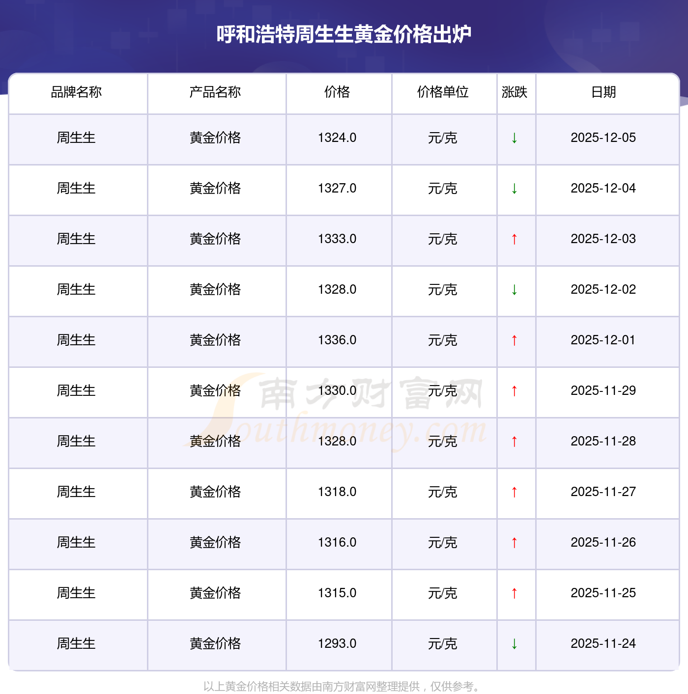 今日呼和浩特周生生黄金价格的价格为1324.0元/克。