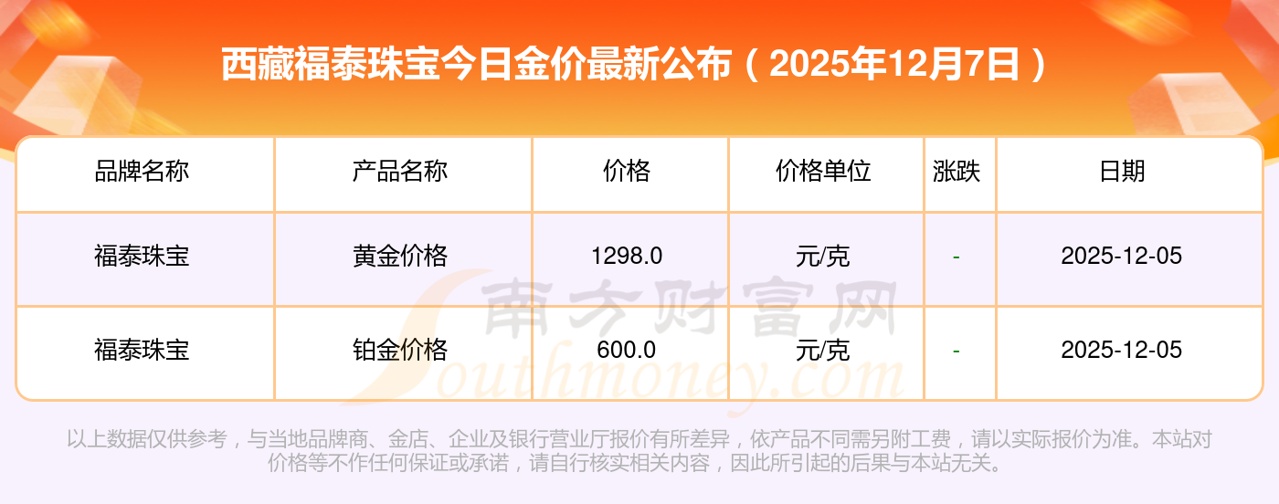 2025年12月7日西藏福泰珠宝一克黄金对应的价格是多少?黄金价格1328.0元/克,铂金价格662.0元/克,饰品金价(内地)1328.0元/克,黄金饰品(香港)46550.0,铂金价格(香港)18970.0,金条价格(香港)41990.0,金条金价(内地)1165.0元/克,黄金价格1325.0元/克,铂金价格600.0元/克,足金价格1325.0元/克,黄金价格1289.0元/克。