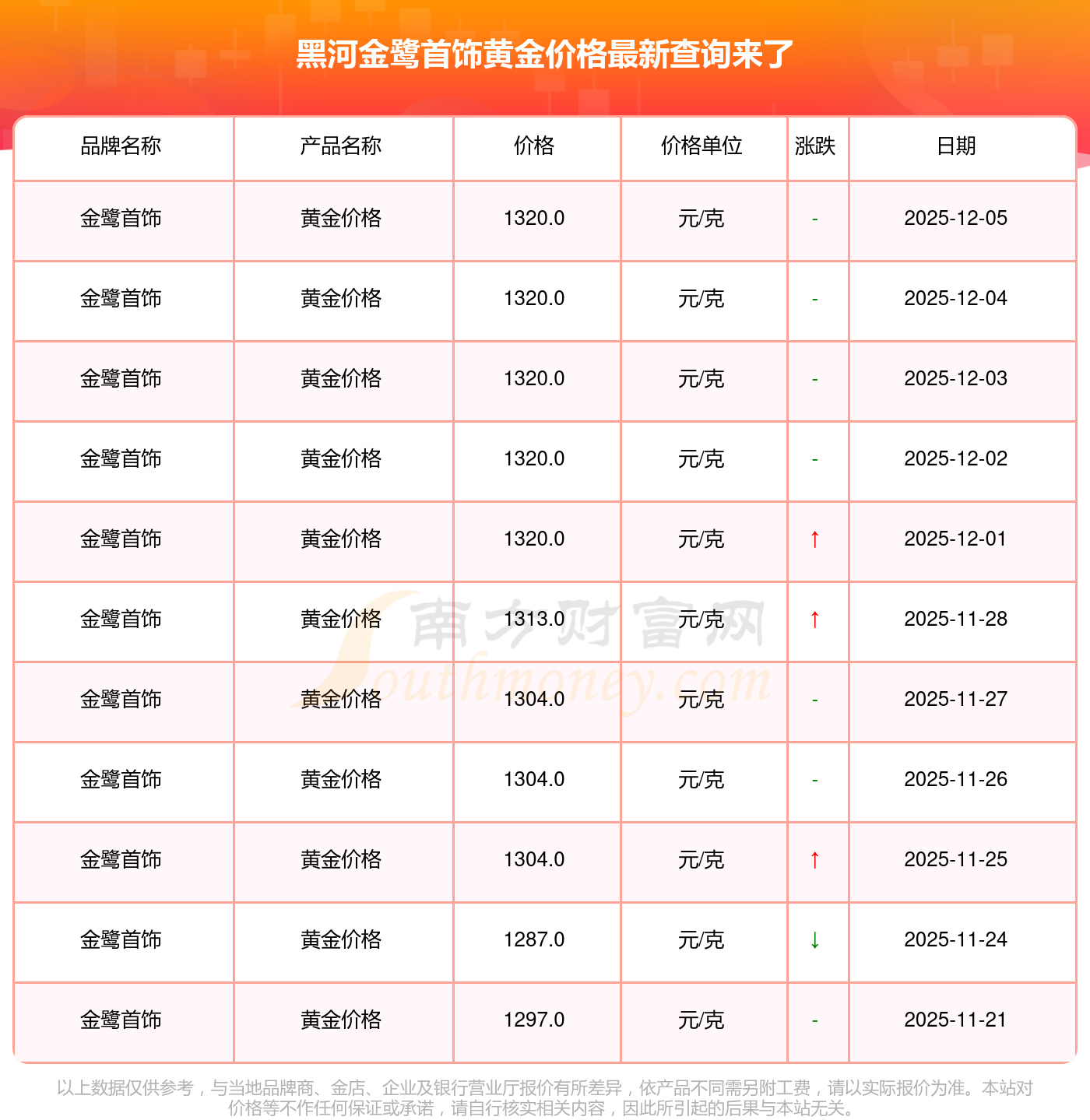 1320.0元/克,此乃黑河金鹭首饰于 2025年12月7日黄金价格的挂牌价格。