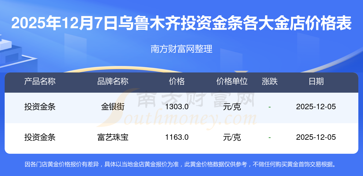 总之,今日乌鲁木齐投资金条最高的金店是金银街,报价1303.0元/克,投资金条最低的金店是富艺珠宝,报价1163.0元/克。今日投资金条高低差为140元/克。