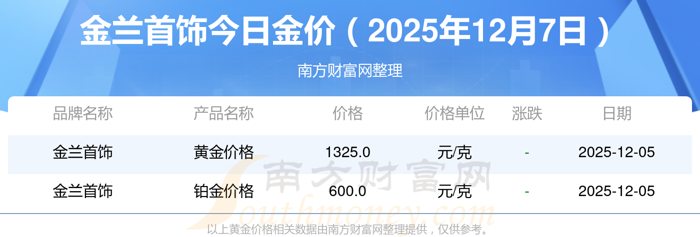 2025年12月7日金兰首饰最新价格:黄金价格1328.0元/克,铂金价格662.0元/克,饰品金价(内地)1328.0元/克,黄金饰品(香港)46550.0,铂金价格(香港)18970.0,金条价格(香港)41990.0,金条金价(内地)1165.0元/克,黄金价格1325.0元/克,铂金价格600.0元/克,足金价格1325.0元/克,黄金价格1289.0元/克。