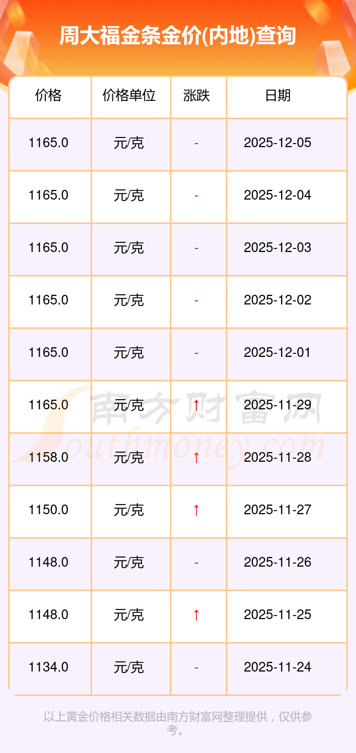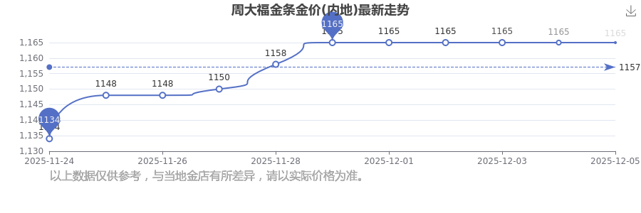 周大福 金条金价(内地)于今日的最新挂牌价为1165.0元/克。