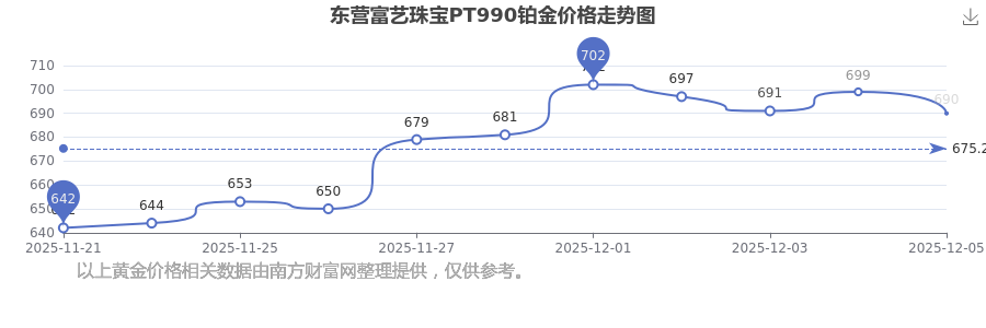 今日东营富艺珠宝PT990铂金价格为690.0元/克。