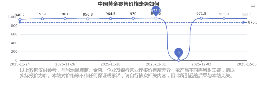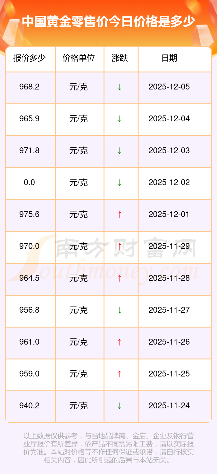 2025年12月7日中国黄金零售价格:968.2元/克。