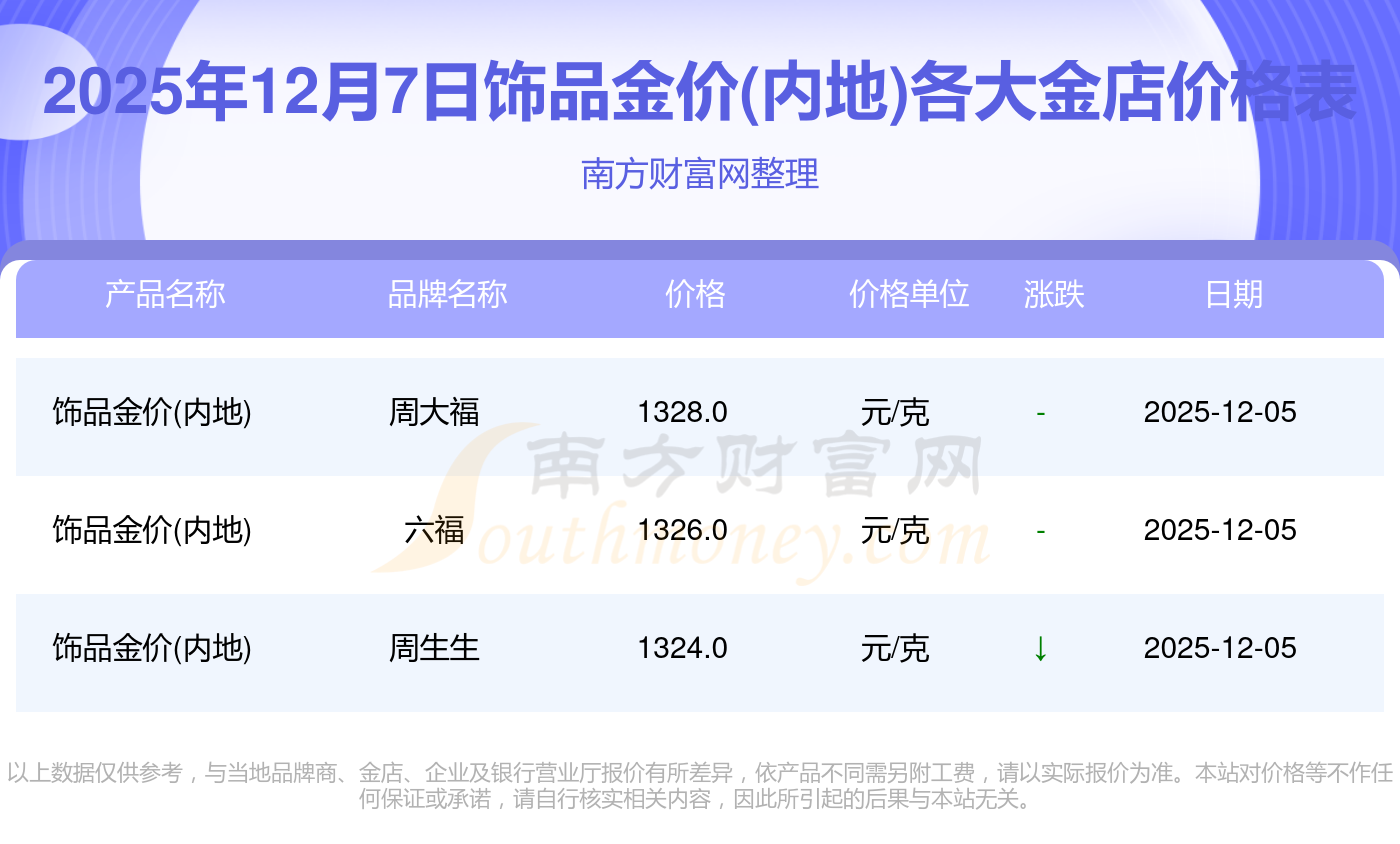 2025年12月7日周大福、周大福、周大福、周大福、周大福、周大福、周大福、老凤祥、老凤祥、老凤祥、周六福等各大金店品牌饰品金价(内地)最新价格如下:周大福黄金价格1328.0元/克,周大福铂金价格662.0元/克,周大福饰品金价(内地)1328.0元/克,周大福黄金饰品(香港)46550.0,周大福铂金价格(香港)18970.0,周大福金条价格(香港)41990.0,周大福金条金价(内地)1165.0元/克,老凤祥黄金价格1325.0元/克,老凤祥铂金价格600.0元/克,老凤祥足金价格1325.0元/克,周六福黄金价格1289.0元/克。
