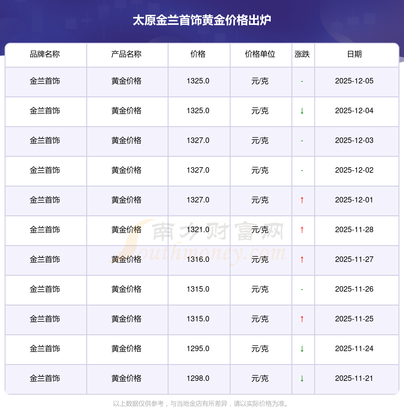 于 2025年12月7日,太原金兰首饰黄金价格的克价为1325.0元/克。