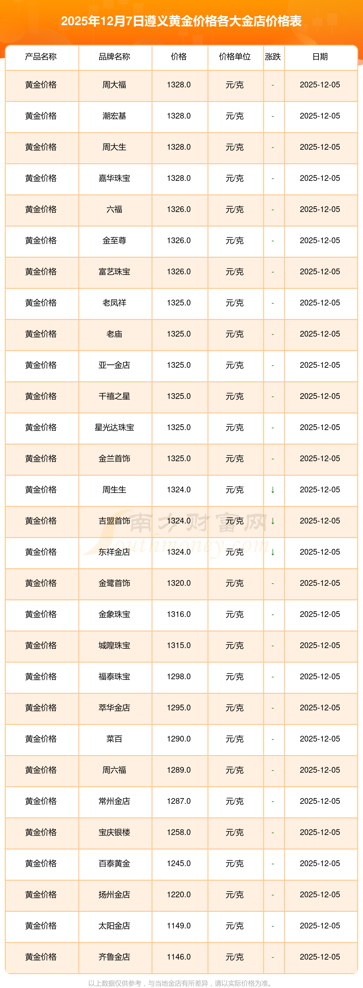 2025年12月7日遵义各大金店黄金价格是多少钱?2025年遵义黄金价格今日价格最新汇总表