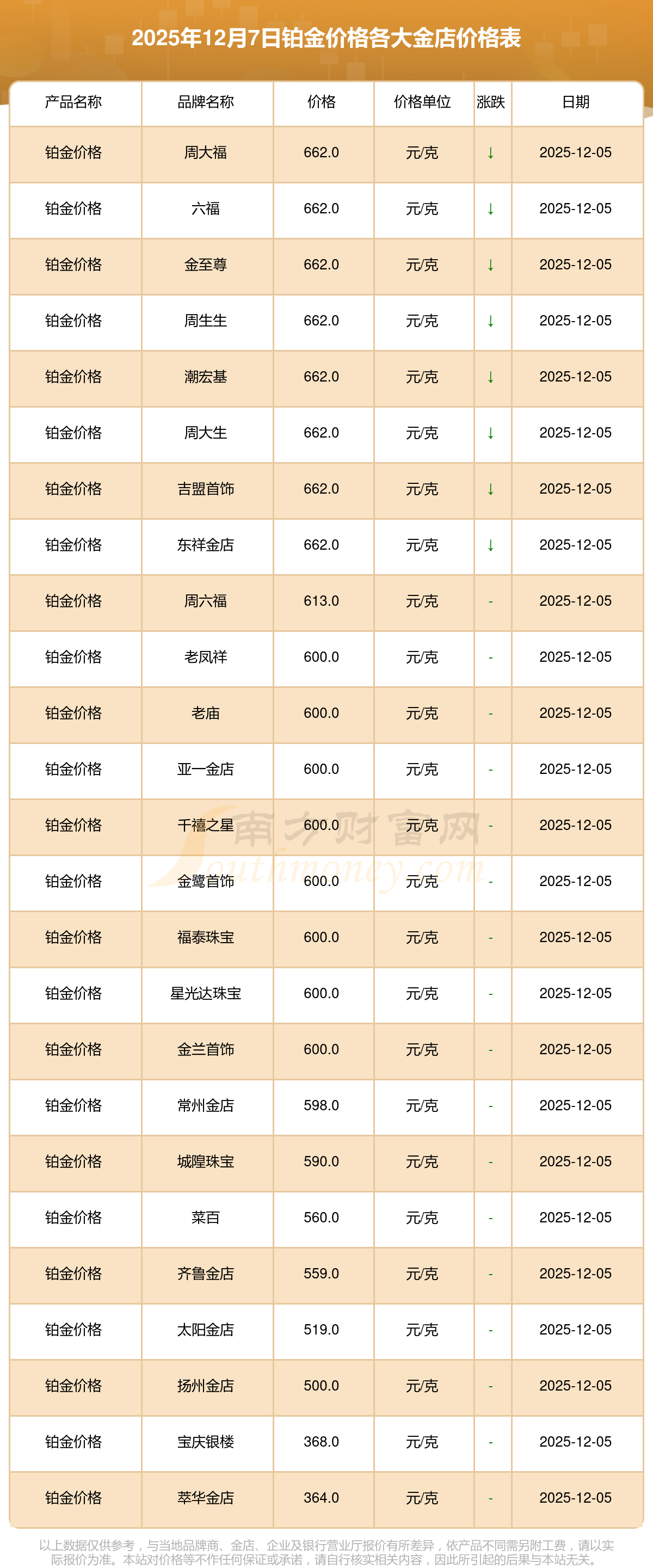 2025年12月7日,周大福、周大福、周大福、周大福、周大福、周大福、周大福、老凤祥、老凤祥、老凤祥、周六福等各大金店品牌铂金价格今日价格如下:周大福1328.0元/克、周大福662.0元/克、周大福1328.0元/克、周大福46550.0、周大福18970.0、周大福41990.0、周大福1165.0元/克、老凤祥1325.0元/克、老凤祥600.0元/克、老凤祥1325.0元/克、周六福1289.0元/克。