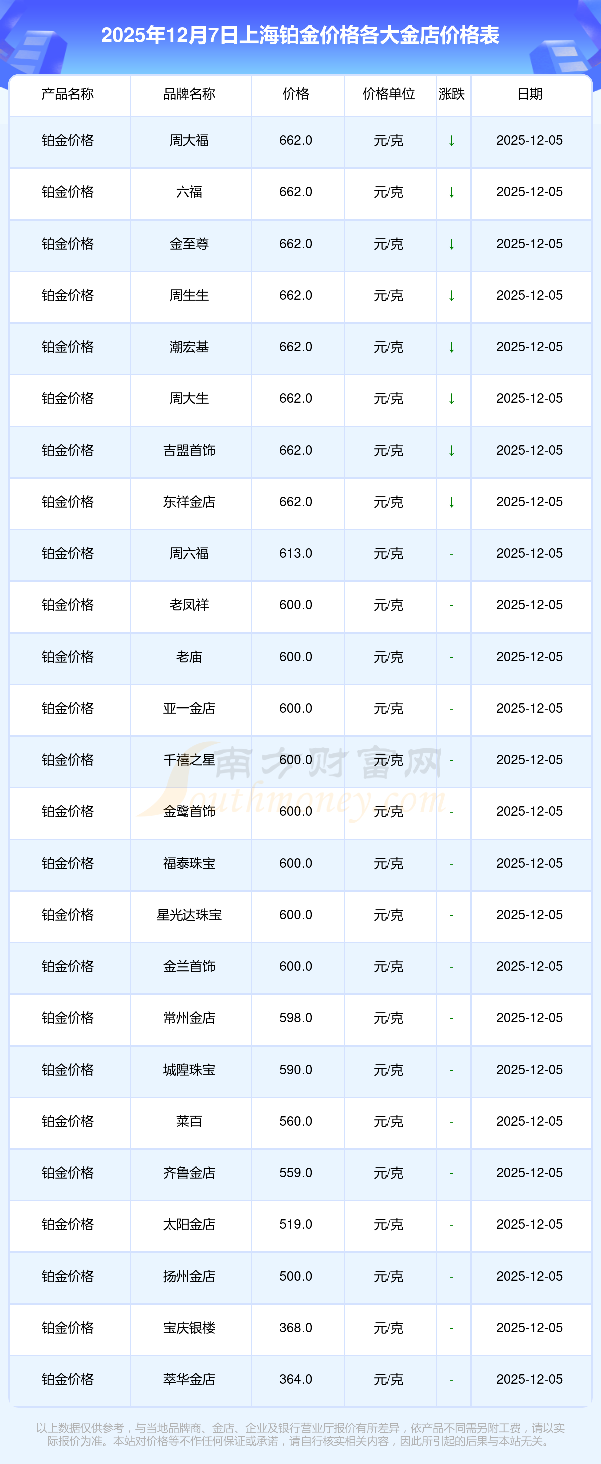 2025年12月7日上海各大金店铂金价格一克多少钱_铂金价格今天价格查询
