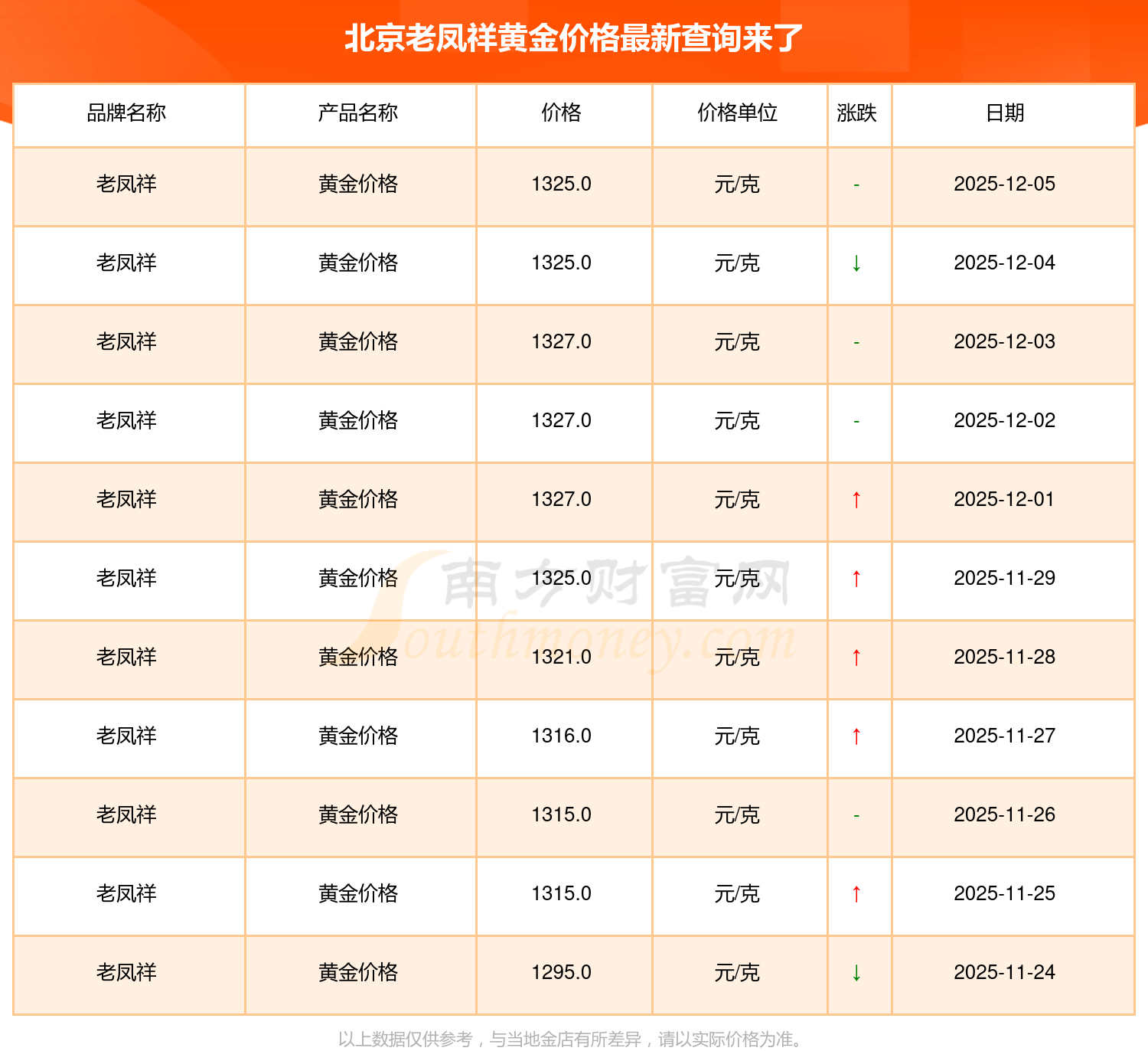 2025年12月7日北京老凤祥黄金价格是1325.0元/克。