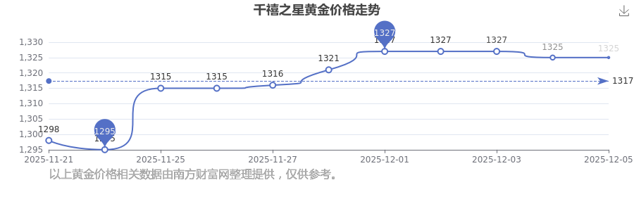 今天黄金价格是多少?现在黄金一克的价钱是怎样的?黄金价格一般是多少钱一克?据了解,今日千禧之星 黄金价格的最新价格为1325.0元/克。