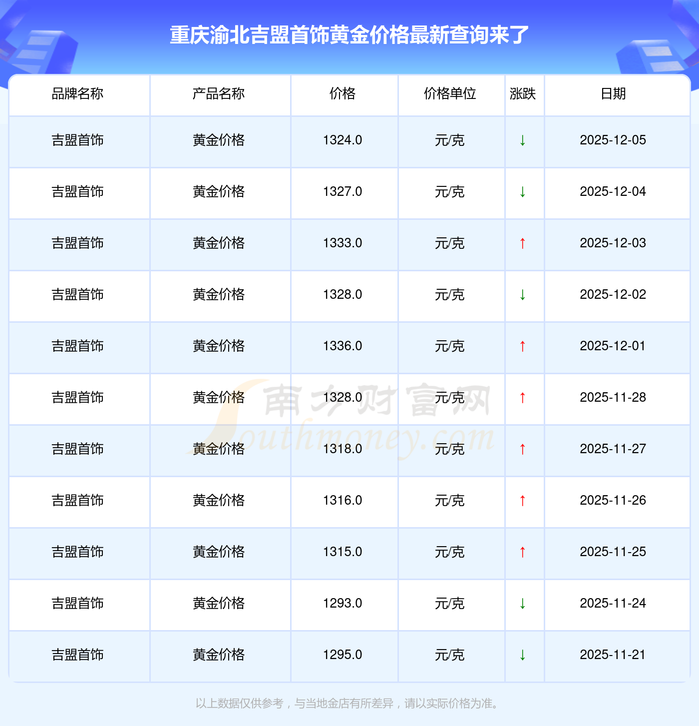 2025年12月7日周大福、周大福、周大福、周大福、周大福、周大福、周大福、老凤祥、老凤祥、老凤祥、周六福等各大金店品牌黄金价格最新价格如下:周大福黄金价格1328.0元/克,周大福铂金价格662.0元/克,周大福饰品金价(内地)1328.0元/克,周大福黄金饰品(香港)46550.0,周大福铂金价格(香港)18970.0,周大福金条价格(香港)41990.0,周大福金条金价(内地)1165.0元/克,老凤祥黄金价格1325.0元/克,老凤祥铂金价格600.0元/克,老凤祥足金价格1325.0元/克,周六福黄金价格1289.0元/克。