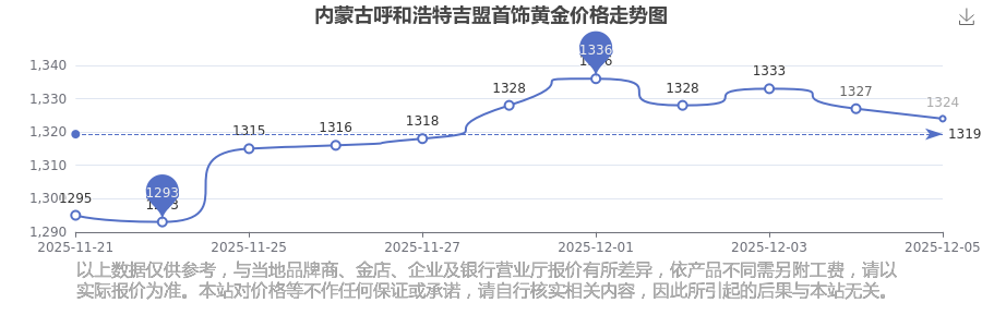今日(2025年12月7日)内蒙古呼和浩特吉盟首饰黄金价格:1324.0元/克。