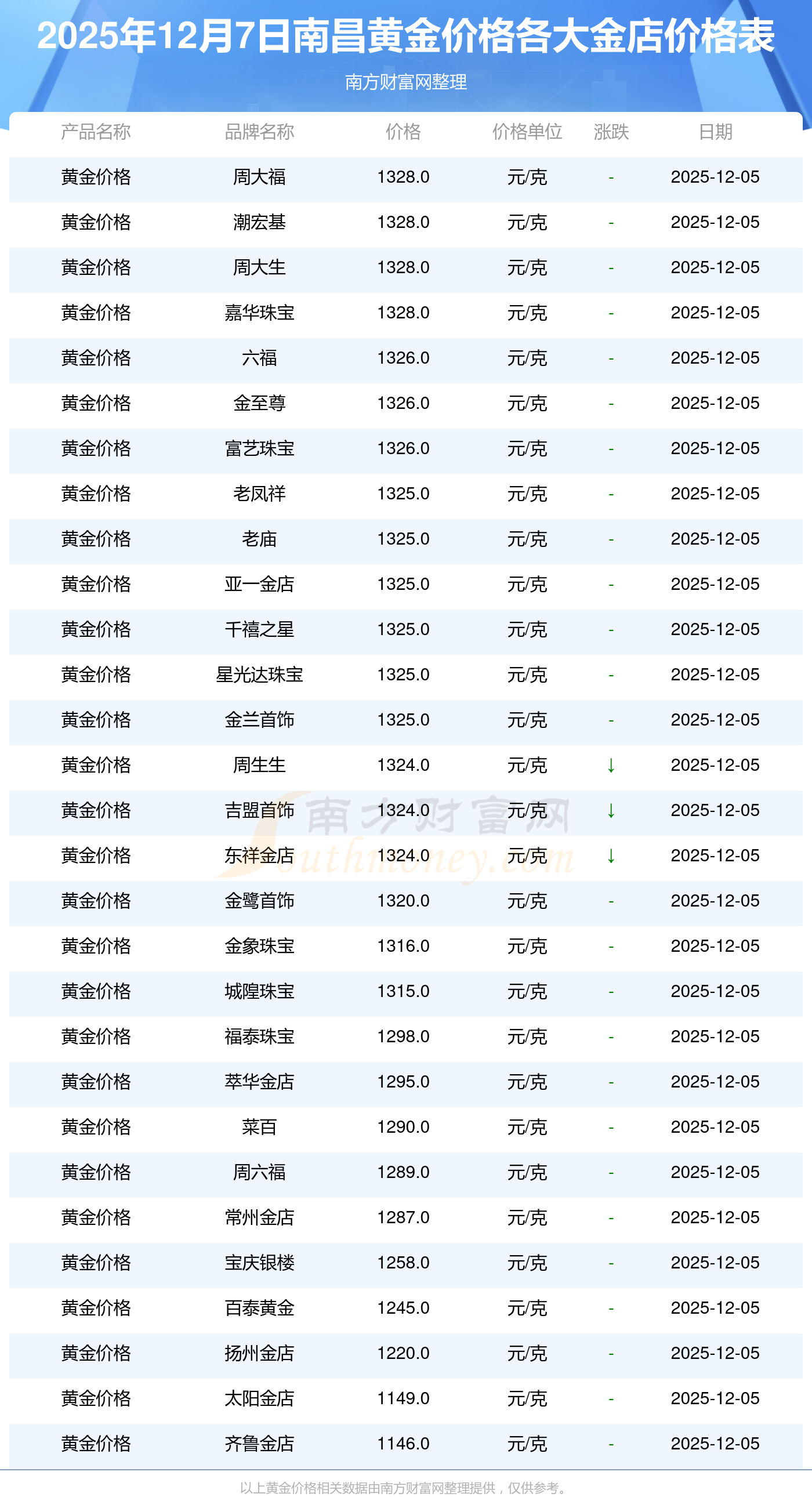 2025年12月7日南昌周大福、周大福、周大福、周大福、周大福、周大福、周大福、老凤祥、老凤祥、老凤祥、周六福等各大金店品牌黄金价格最新价格行情来了,如下:周大福黄金价格1328.0元/克,周大福铂金价格662.0元/克,周大福饰品金价(内地)1328.0元/克,周大福黄金饰品(香港)46550.0,周大福铂金价格(香港)18970.0,周大福金条价格(香港)41990.0,周大福金条金价(内地)1165.0元/克,老凤祥黄金价格1325.0元/克,老凤祥铂金价格600.0元/克,老凤祥足金价格1325.0元/克,周六福黄金价格1289.0元/克。