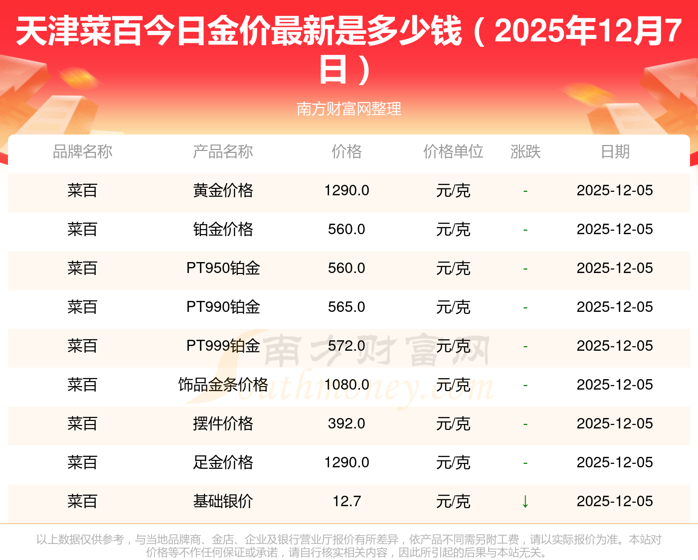 2025年12月7日天津菜百现在黄金一克要多少钱:黄金价格1328.0元/克,铂金价格662.0元/克,饰品金价(内地)1328.0元/克,黄金饰品(香港)46550.0,铂金价格(香港)18970.0,金条价格(香港)41990.0,金条金价(内地)1165.0元/克,黄金价格1325.0元/克,铂金价格600.0元/克,足金价格1325.0元/克,黄金价格1289.0元/克。