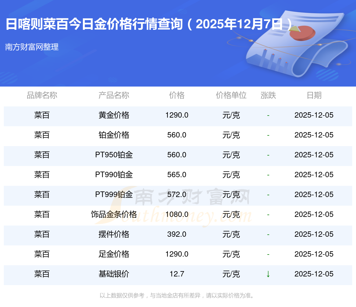 以上数据仅供参考,与当地品牌商、金店、企业及银行营业厅报价有所差异,依产品不同需另附工费,请以实际报价为准。本站对价格等不作任何保证或承诺,请自行核实相关内容,因此所引起的后果与本站无关。