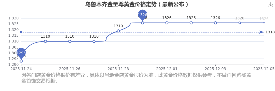 今日乌鲁木齐金至尊黄金价格是1326.0元/克。