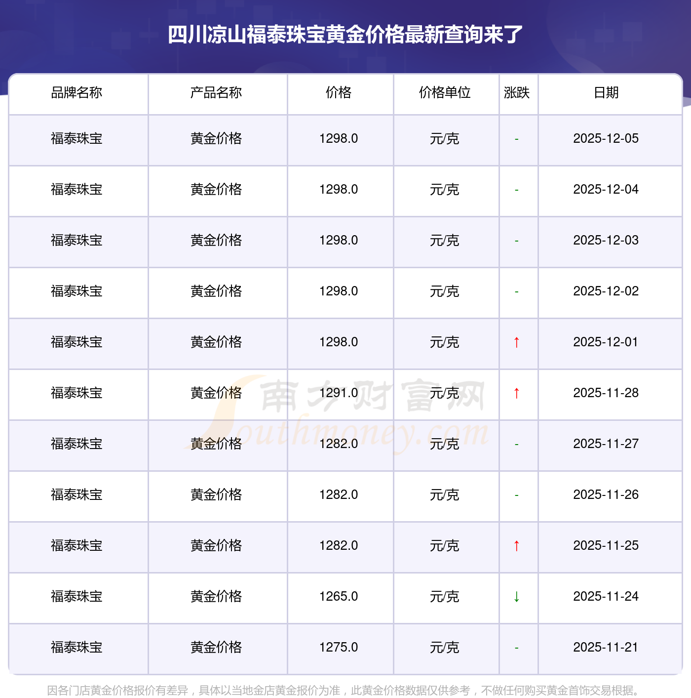 四川凉山福泰珠宝 2025年12月7日的黄金价格价位为 1298.0元/克。