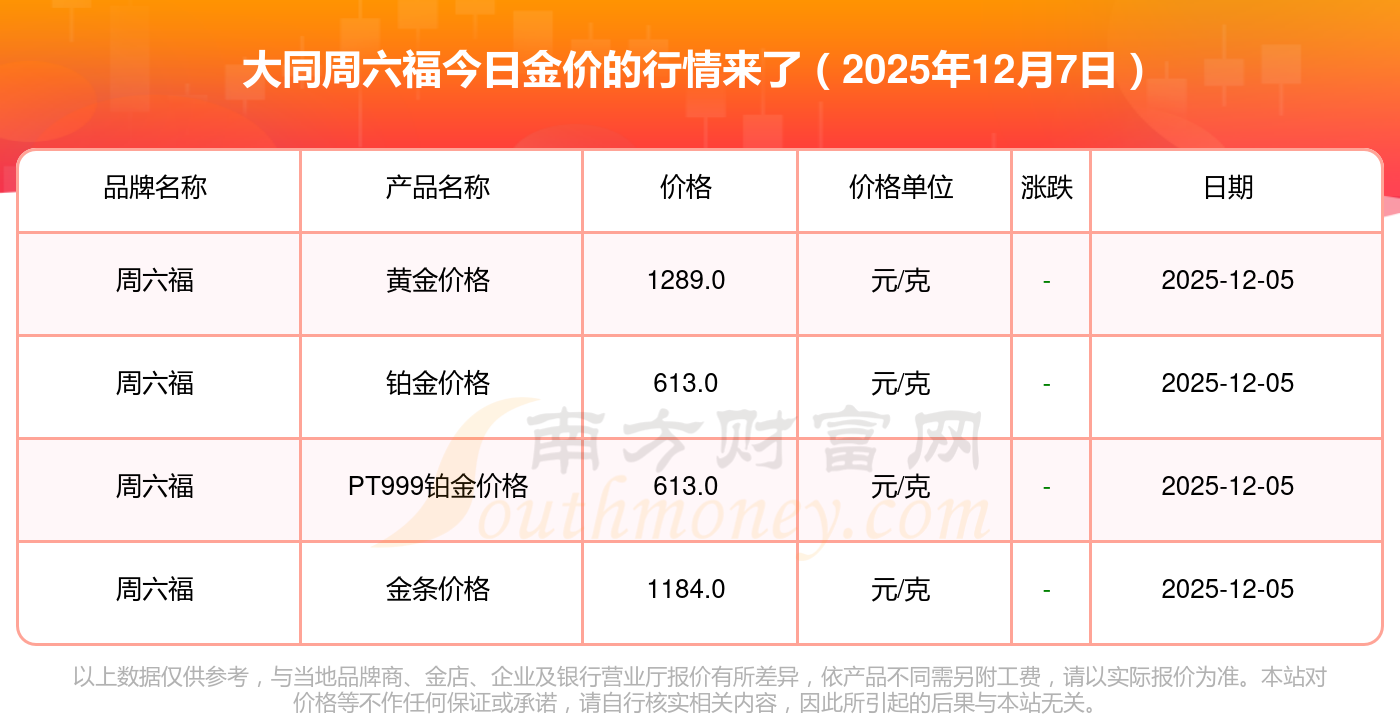 2025年12月7日大同周六福黄金的单价,一克为多少?黄金价格1328.0元/克,铂金价格662.0元/克,饰品金价(内地)1328.0元/克,黄金饰品(香港)46550.0,铂金价格(香港)18970.0,金条价格(香港)41990.0,金条金价(内地)1165.0元/克,黄金价格1325.0元/克,铂金价格600.0元/克,足金价格1325.0元/克,黄金价格1289.0元/克。