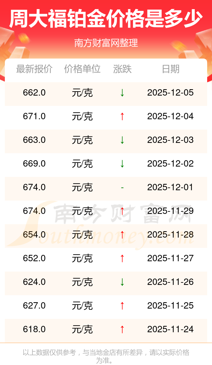 周大福今日铂金价格的最新市场行情价为662.0元/克。
