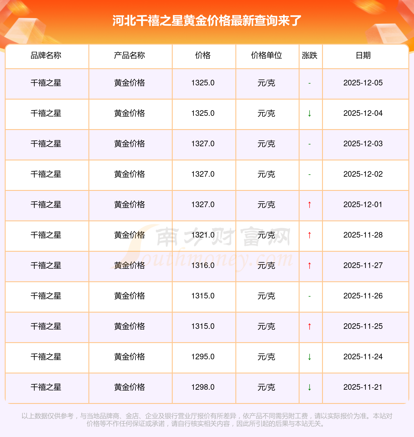 河北千禧之星黄金价格现在每克多少钱?今日黄金一克需花费多少钱?今日河北千禧之星黄金价格查询,2025年12月7日,河北千禧之星的黄金价格标价达到 1325.0元/克。