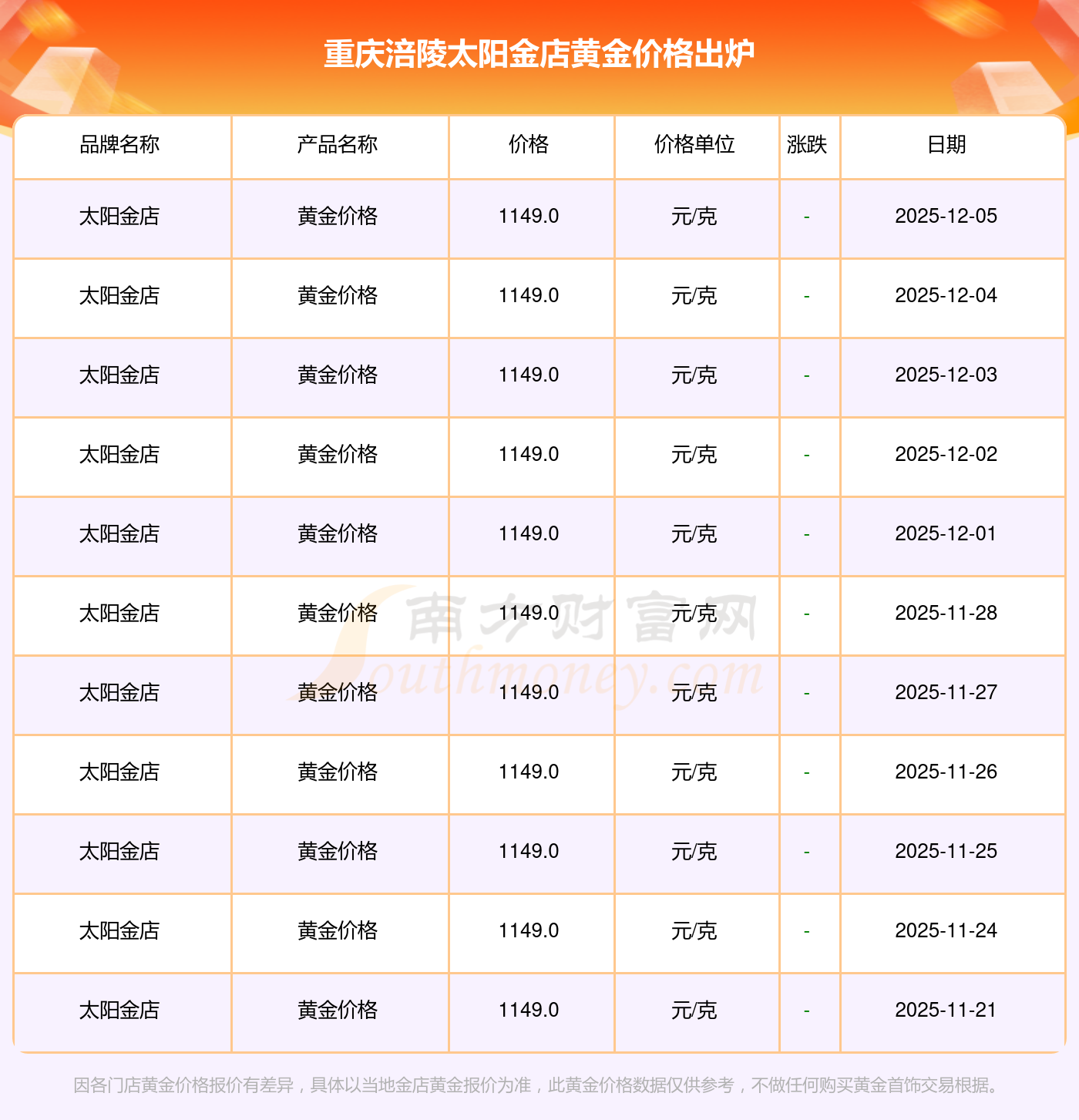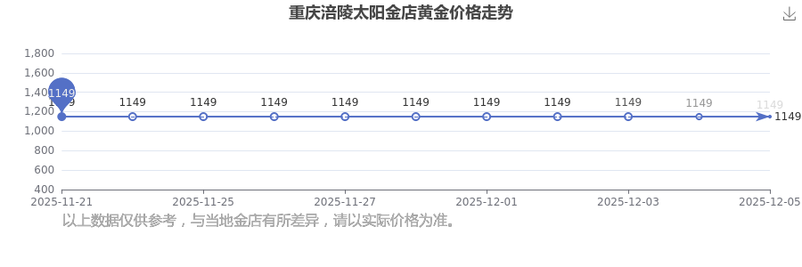 重庆涪陵太阳金店的黄金价格在今日(2025年12月7日),每克售价为1149.0元/克。