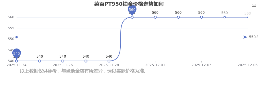 目前菜百 PT950铂金的价格,今日最新为560.0元/克。