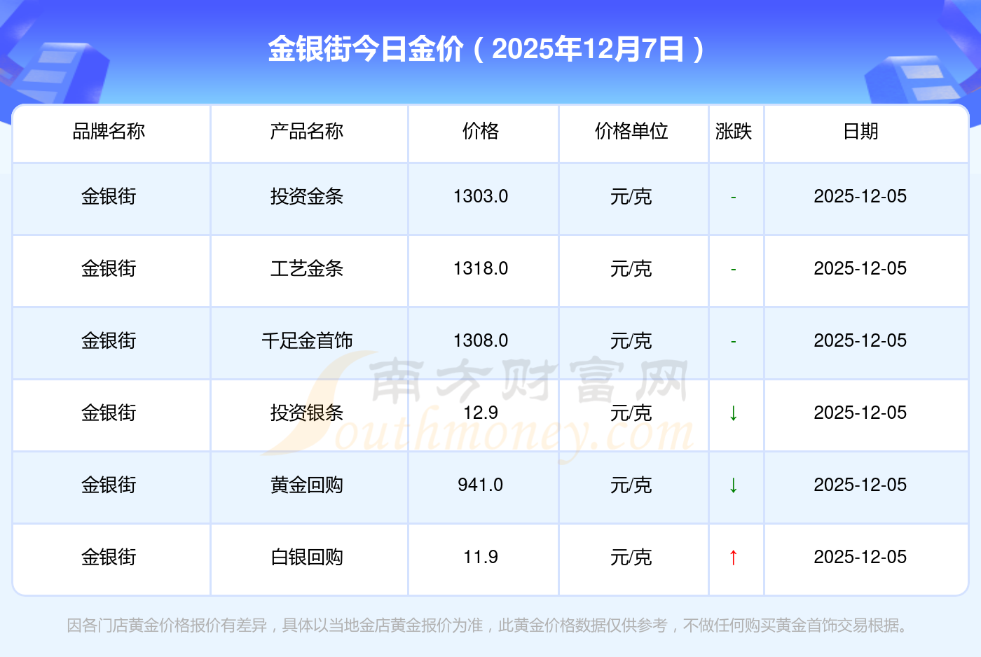 2025年12月7日金银街金价查询:黄金价格1328.0元/克,铂金价格662.0元/克,饰品金价(内地)1328.0元/克,黄金饰品(香港)46550.0,铂金价格(香港)18970.0,金条价格(香港)41990.0,金条金价(内地)1165.0元/克,黄金价格1325.0元/克,铂金价格600.0元/克,足金价格1325.0元/克,黄金价格1289.0元/克。