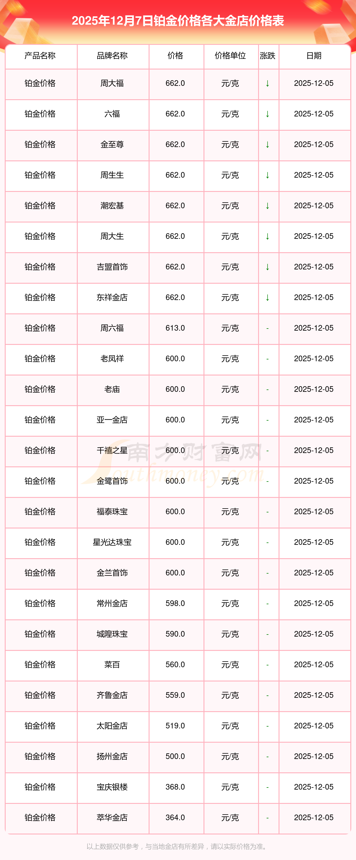 今天是2025年12月7日,周大福、周大福、周大福、周大福、周大福、周大福、周大福、老凤祥、老凤祥、老凤祥、周六福等各大金店品牌铂金价格最新价格如下:周大福1328.0元/克、周大福662.0元/克、周大福1328.0元/克、周大福46550.0、周大福18970.0、周大福41990.0、周大福1165.0元/克、老凤祥1325.0元/克、老凤祥600.0元/克、老凤祥1325.0元/克、周六福1289.0元/克。