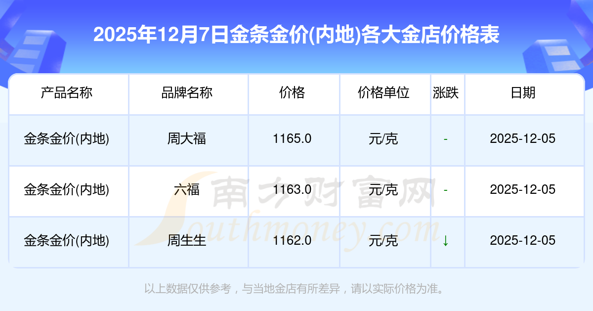 今天是2025年12月7日,周大福、周大福、周大福、周大福、周大福、周大福、周大福、老凤祥、老凤祥、老凤祥、周六福等各大金店品牌金条金价(内地)最新价格如下:周大福1328.0元/克、周大福662.0元/克、周大福1328.0元/克、周大福46550.0、周大福18970.0、周大福41990.0、周大福1165.0元/克、老凤祥1325.0元/克、老凤祥600.0元/克、老凤祥1325.0元/克、周六福1289.0元/克。