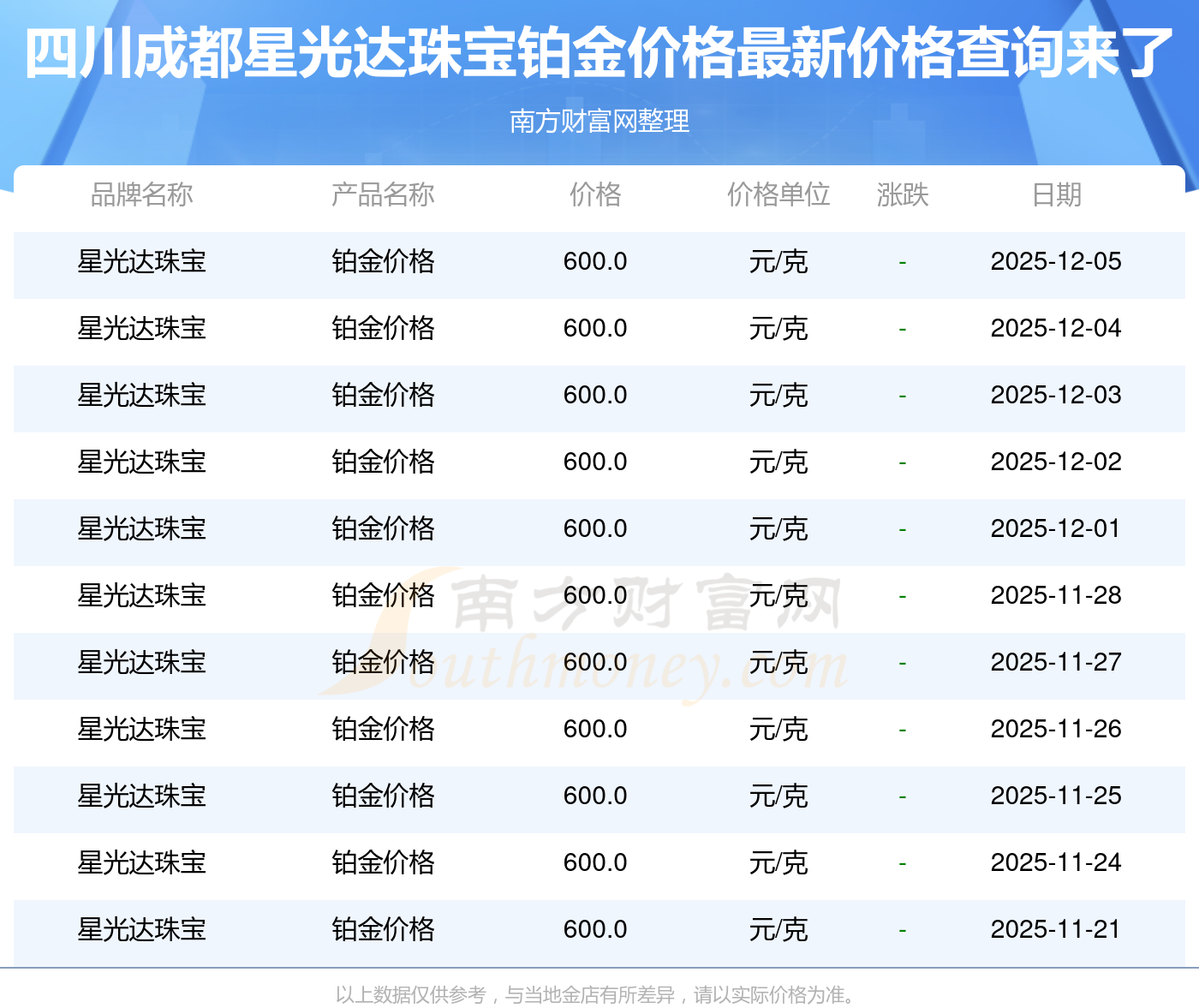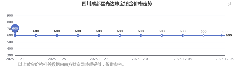2025年12月7日,四川成都星光达珠宝所售铂金价格,其价格设定为 600.0元/克。