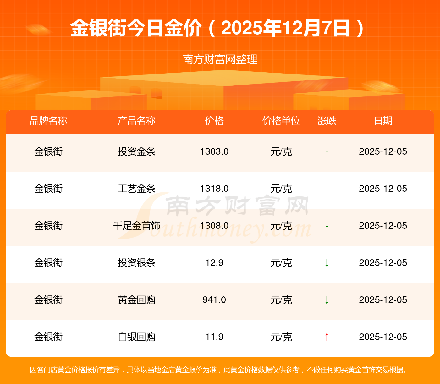 2025年12月7日各大金店投资金条最新价格:周大福1328.0元/克,周大福662.0元/克,周大福1328.0元/克,周大福46550.0,周大福18970.0,周大福41990.0,周大福1165.0元/克,老凤祥1325.0元/克,老凤祥600.0元/克,老凤祥1325.0元/克,周六福1289.0元/克。