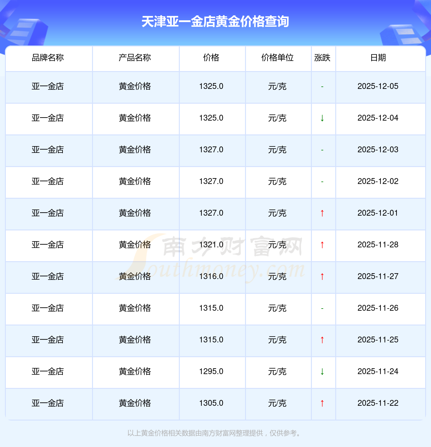 1325.0元/克的黄金价格,是天津亚一金店在 2025年12月7日给出的。