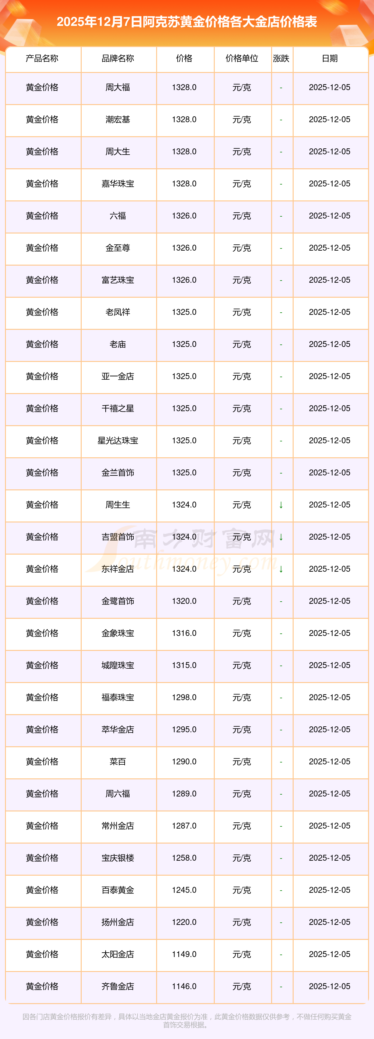 今天是2025年12月7日,阿克苏周大福、周大福、周大福、周大福、周大福、周大福、周大福、老凤祥、老凤祥、老凤祥、周六福等各大金店品牌黄金价格最新价格行情是这样的:周大福1328.0元/克、周大福662.0元/克、周大福1328.0元/克、周大福46550.0、周大福18970.0、周大福41990.0、周大福1165.0元/克、老凤祥1325.0元/克、老凤祥600.0元/克、老凤祥1325.0元/克、周六福1289.0元/克。