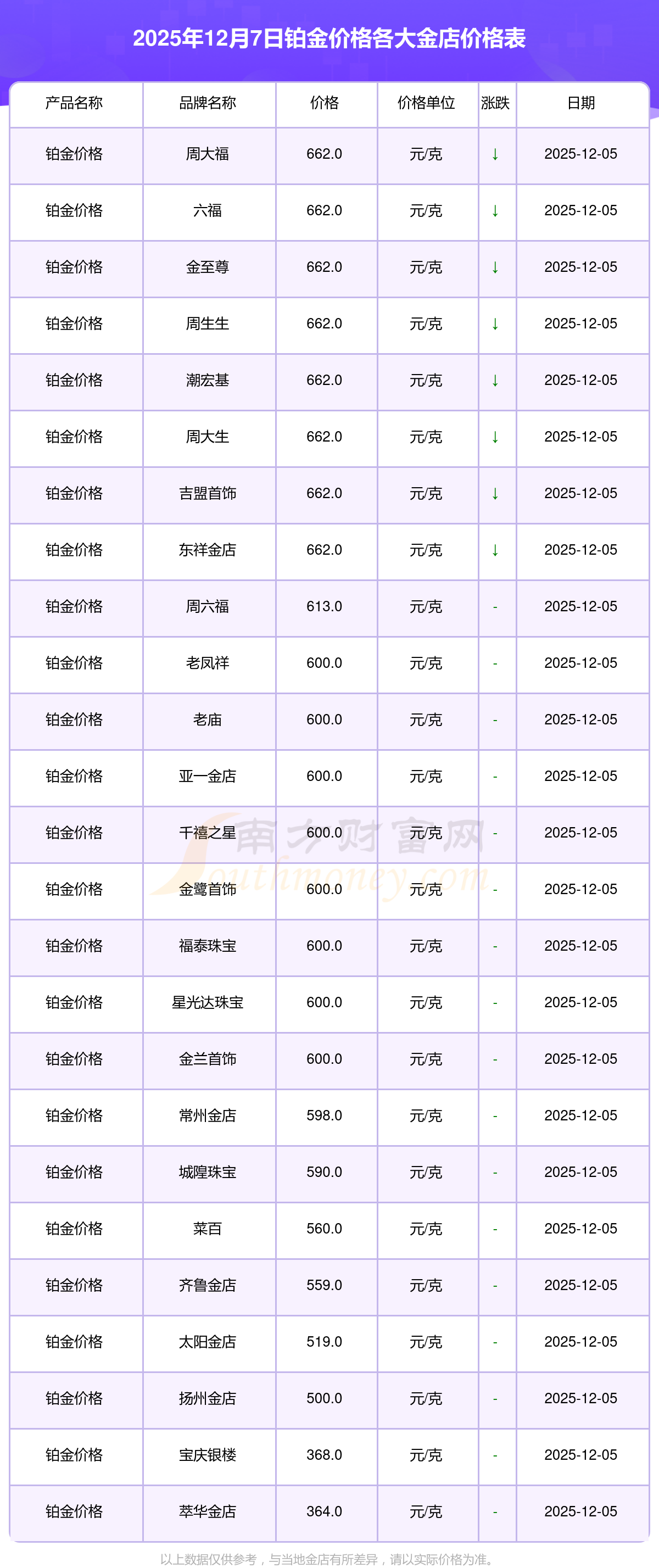 2025年12月7日各大金店铂金价格最新价格:周大福1328.0元/克,周大福662.0元/克,周大福1328.0元/克,周大福46550.0,周大福18970.0,周大福41990.0,周大福1165.0元/克,老凤祥1325.0元/克,老凤祥600.0元/克,老凤祥1325.0元/克,周六福1289.0元/克。