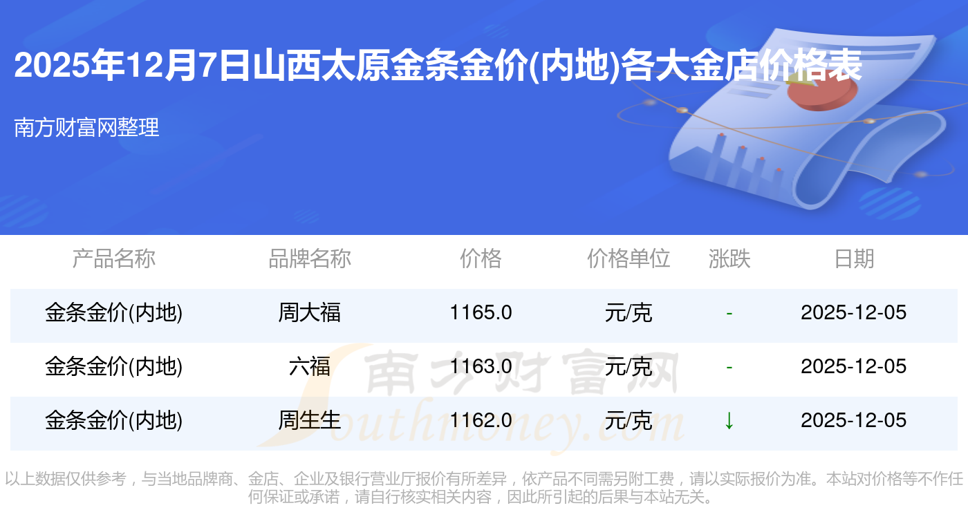 2025年12月7日山西太原周大福、周大福、周大福、周大福、周大福、周大福、周大福、老凤祥、老凤祥、老凤祥、周六福等各大金店品牌金条金价(内地)最新价格行情来了,如下:周大福黄金价格1328.0元/克,周大福铂金价格662.0元/克,周大福饰品金价(内地)1328.0元/克,周大福黄金饰品(香港)46550.0,周大福铂金价格(香港)18970.0,周大福金条价格(香港)41990.0,周大福金条金价(内地)1165.0元/克,老凤祥黄金价格1325.0元/克,老凤祥铂金价格600.0元/克,老凤祥足金价格1325.0元/克,周六福黄金价格1289.0元/克。