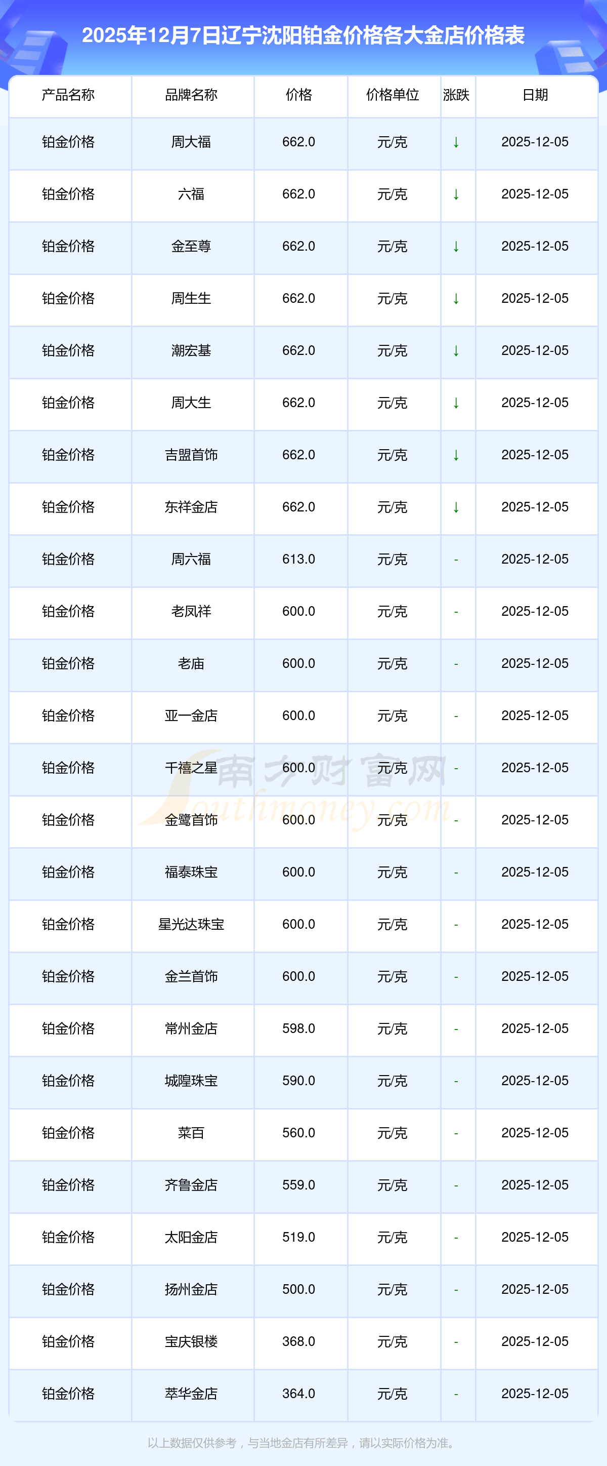 今日辽宁沈阳铂金价格最低的金店是萃华金店,报价364.0元/克,最高的是周大福,报价662.0元/克。今日铂金价格高低差为298元/克。