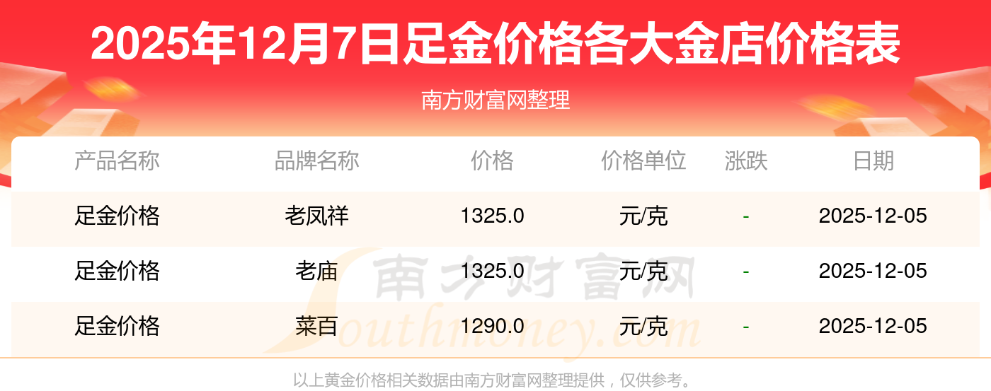 2025年12月7日周大福、周大福、周大福、周大福、周大福、周大福、周大福、老凤祥、老凤祥、老凤祥、周六福等各大金店品牌足金价格最新价格如下:周大福黄金价格1328.0元/克,周大福铂金价格662.0元/克,周大福饰品金价(内地)1328.0元/克,周大福黄金饰品(香港)46550.0,周大福铂金价格(香港)18970.0,周大福金条价格(香港)41990.0,周大福金条金价(内地)1165.0元/克,老凤祥黄金价格1325.0元/克,老凤祥铂金价格600.0元/克,老凤祥足金价格1325.0元/克,周六福黄金价格1289.0元/克。