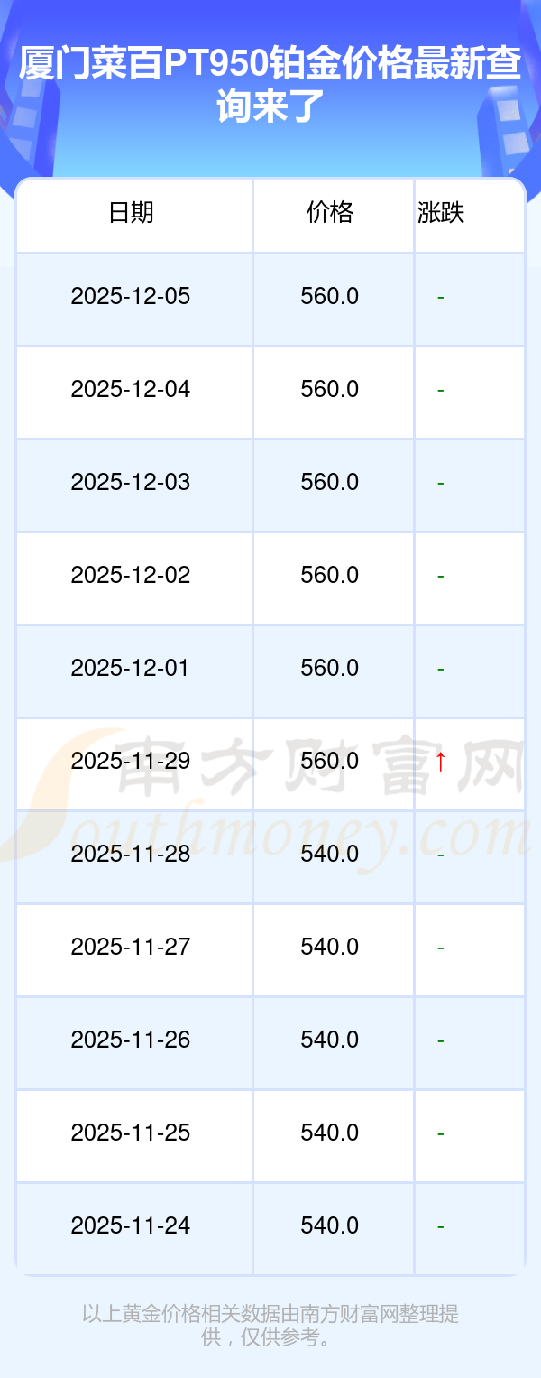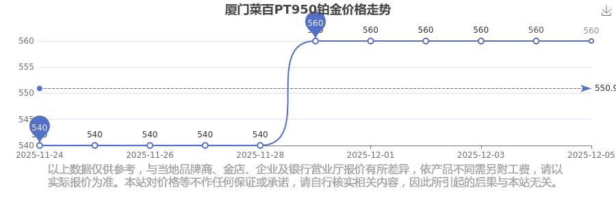 今日厦门菜百PT950铂金价格为560.0元/克。