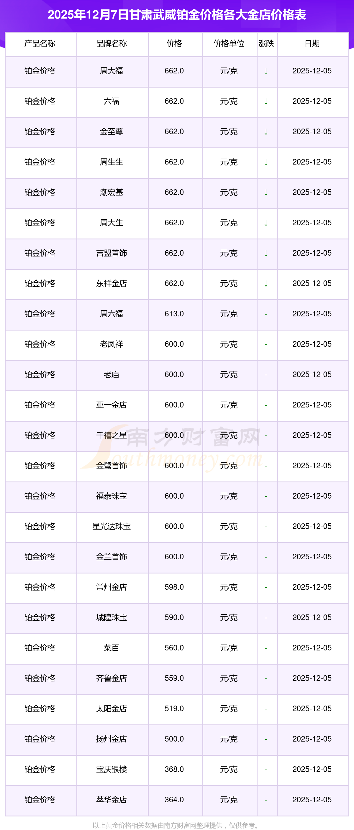 今天是2025年12月7日,甘肃武威周大福、周大福、周大福、周大福、周大福、周大福、周大福、老凤祥、老凤祥、老凤祥、周六福等各大金店品牌铂金价格最新价格如下:周大福1328.0元/克、周大福662.0元/克、周大福1328.0元/克、周大福46550.0、周大福18970.0、周大福41990.0、周大福1165.0元/克、老凤祥1325.0元/克、老凤祥600.0元/克、老凤祥1325.0元/克、周六福1289.0元/克。
