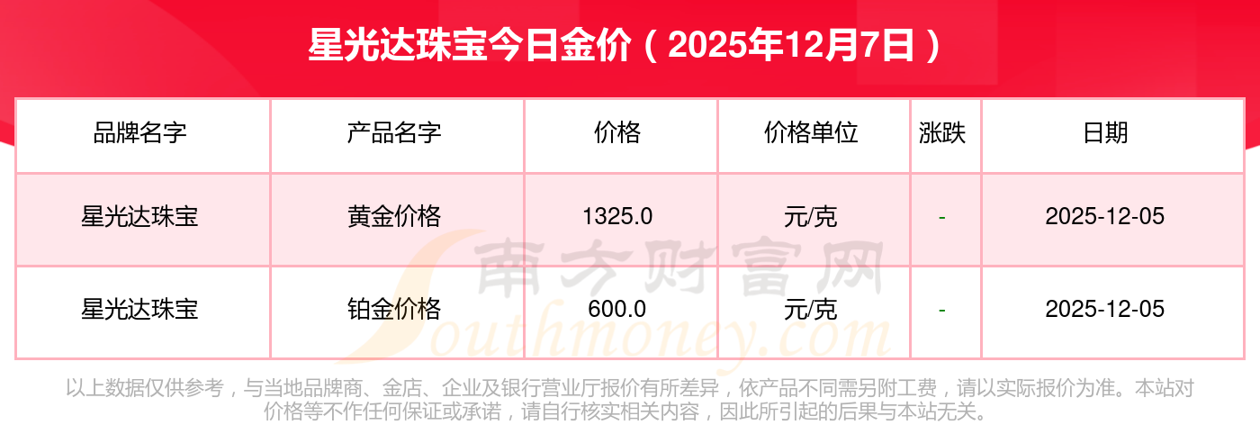 星光达珠宝今日黄金价格行情如何:黄金价格1328.0元/克,铂金价格662.0元/克,饰品金价(内地)1328.0元/克,黄金饰品(香港)46550.0,铂金价格(香港)18970.0,金条价格(香港)41990.0,金条金价(内地)1165.0元/克,黄金价格1325.0元/克,铂金价格600.0元/克,足金价格1325.0元/克,黄金价格1289.0元/克。