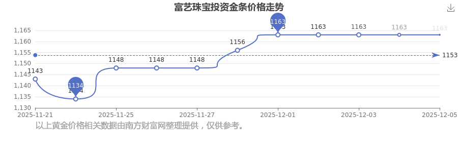 1163.0元/克的价格,是富艺珠宝今日 投资金条的最新行情。