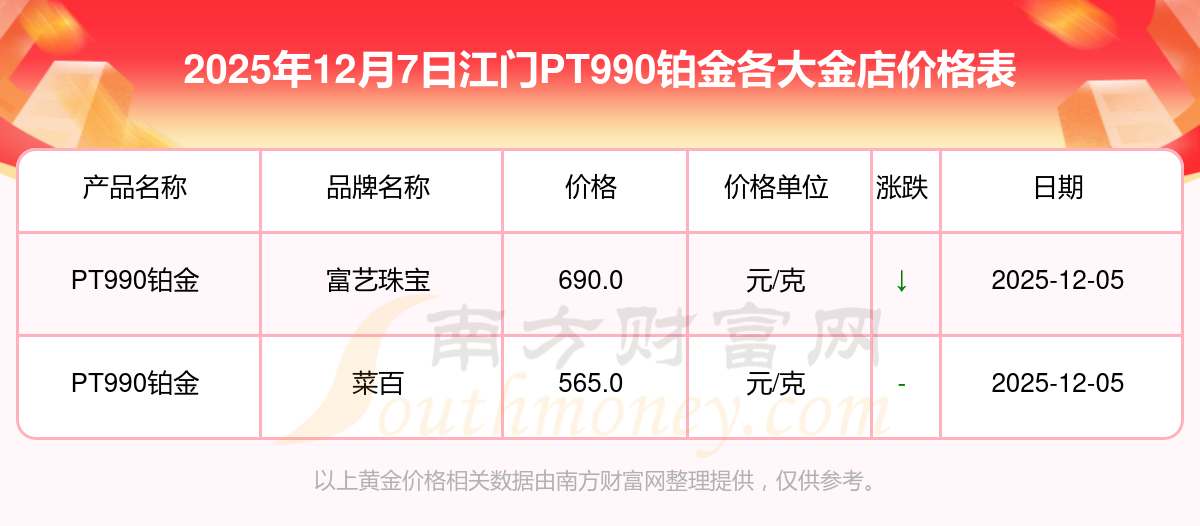 据了解,今日江门PT990铂金最低的金店是菜百,报价565.0元/克,最高的是富艺珠宝,报价690.0元/克。今日PT990铂金高低差为125元/克。