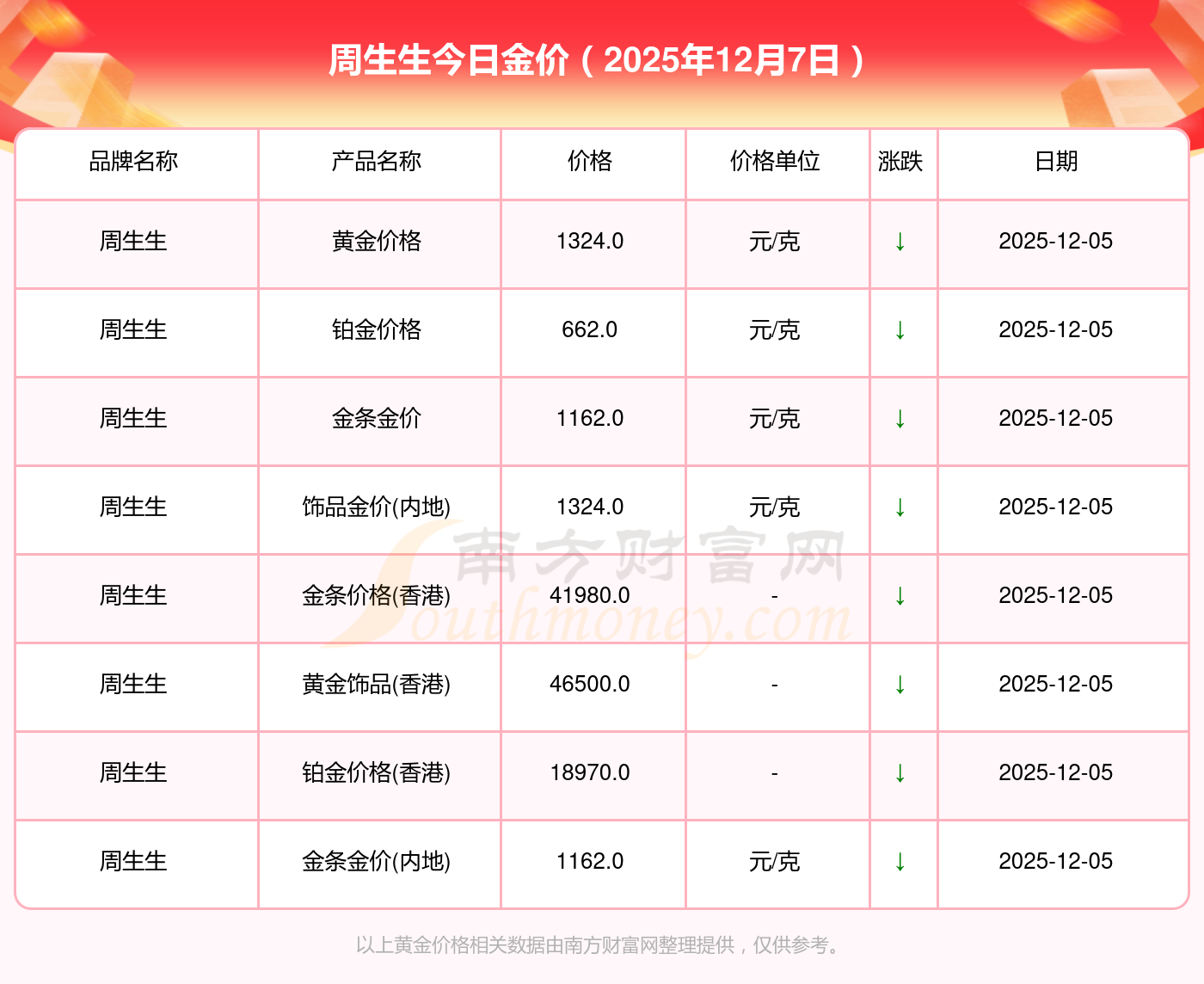 2025年12月7日各大金店黄金价格最新价格:周大福1328.0元/克,周大福662.0元/克,周大福1328.0元/克,周大福46550.0,周大福18970.0,周大福41990.0,周大福1165.0元/克,老凤祥1325.0元/克,老凤祥600.0元/克,老凤祥1325.0元/克,周六福1289.0元/克。