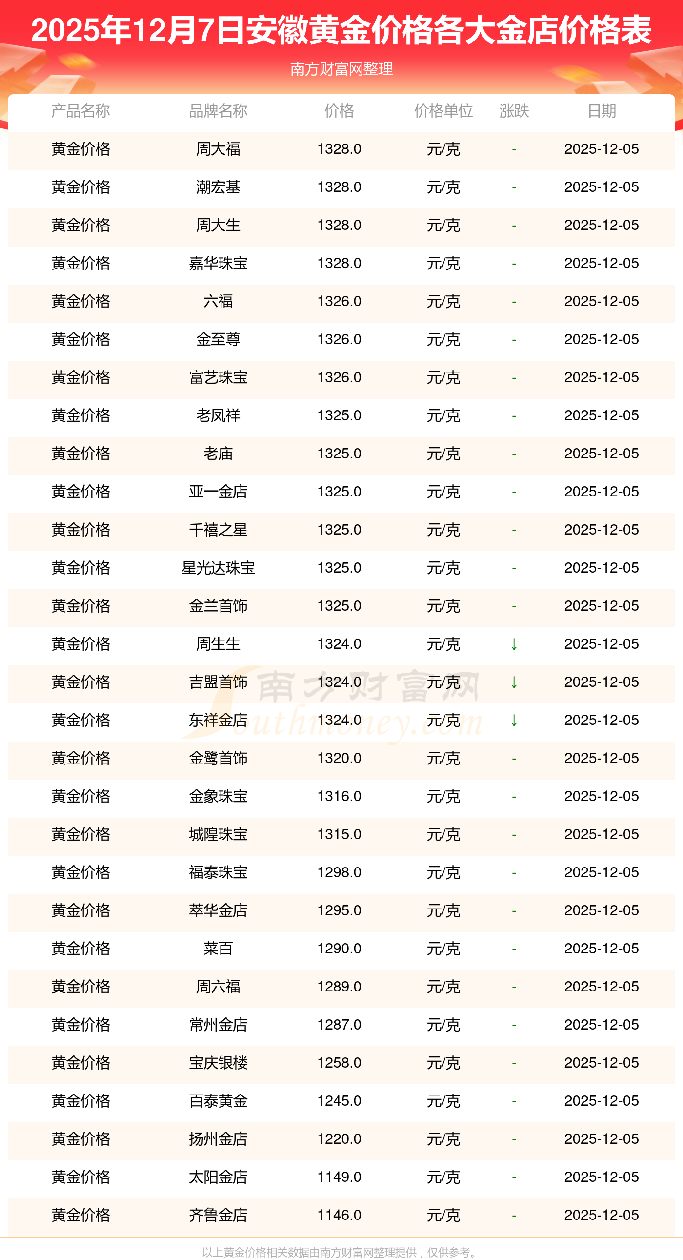 今天是2025年12月7日,安徽周大福、周大福、周大福、周大福、周大福、周大福、周大福、老凤祥、老凤祥、老凤祥、周六福等各大金店品牌黄金价格最新价格行情是这样的:周大福1328.0元/克、周大福662.0元/克、周大福1328.0元/克、周大福46550.0、周大福18970.0、周大福41990.0、周大福1165.0元/克、老凤祥1325.0元/克、老凤祥600.0元/克、老凤祥1325.0元/克、周六福1289.0元/克。
