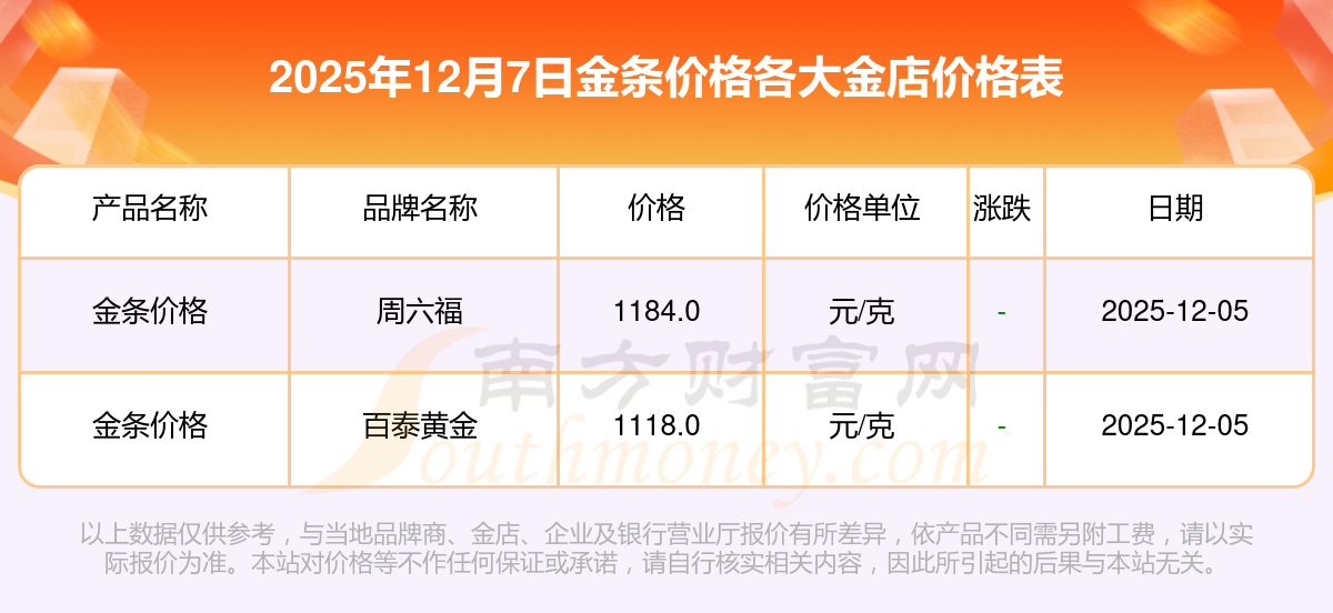 2025年12月7日周大福、周大福、周大福、周大福、周大福、周大福、周大福、老凤祥、老凤祥、老凤祥、周六福等各大金店品牌金条价格最新价格如下:周大福黄金价格1328.0元/克,周大福铂金价格662.0元/克,周大福饰品金价(内地)1328.0元/克,周大福黄金饰品(香港)46550.0,周大福铂金价格(香港)18970.0,周大福金条价格(香港)41990.0,周大福金条金价(内地)1165.0元/克,老凤祥黄金价格1325.0元/克,老凤祥铂金价格600.0元/克,老凤祥足金价格1325.0元/克,周六福黄金价格1289.0元/克。