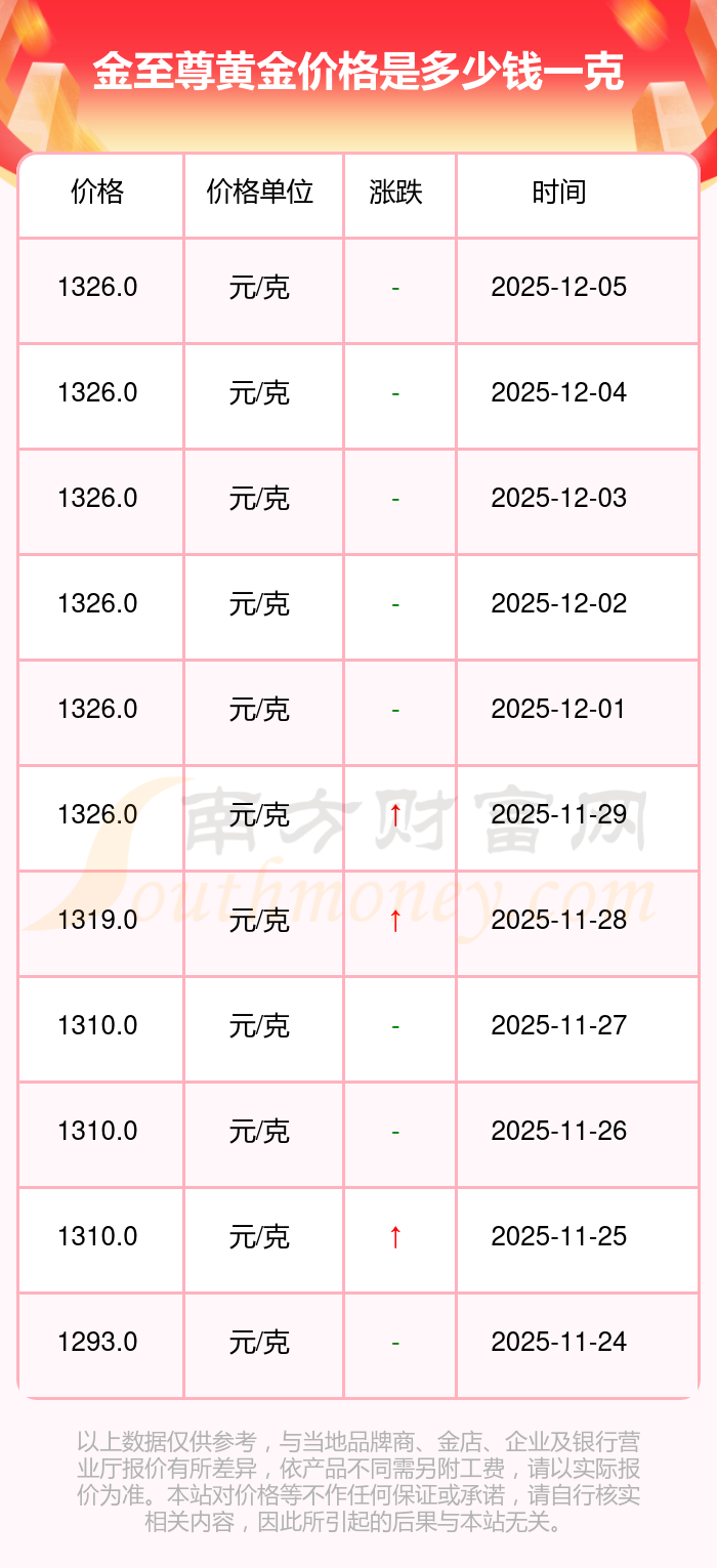 今日黄金价格查询_现在金价黄金一克多少钱,黄金价格是多少钱一克?黄金是一种优良的导电导热材料,具有良好的导热特性。黄金常用于电子工业中的特殊电路设计,因其化学稳定性高、抗氧化性强,可制作高精度电子元件。今日(2025年12月7日),金至尊黄金价格:1326.0元/克。