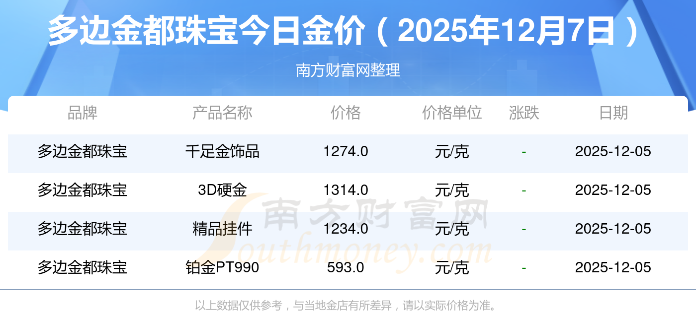 2025年12月7日多边金都珠宝今日价格:黄金价格1328.0元/克,铂金价格662.0元/克,饰品金价(内地)1328.0元/克,黄金饰品(香港)46550.0,铂金价格(香港)18970.0,金条价格(香港)41990.0,金条金价(内地)1165.0元/克,黄金价格1325.0元/克,铂金价格600.0元/克,足金价格1325.0元/克,黄金价格1289.0元/克。