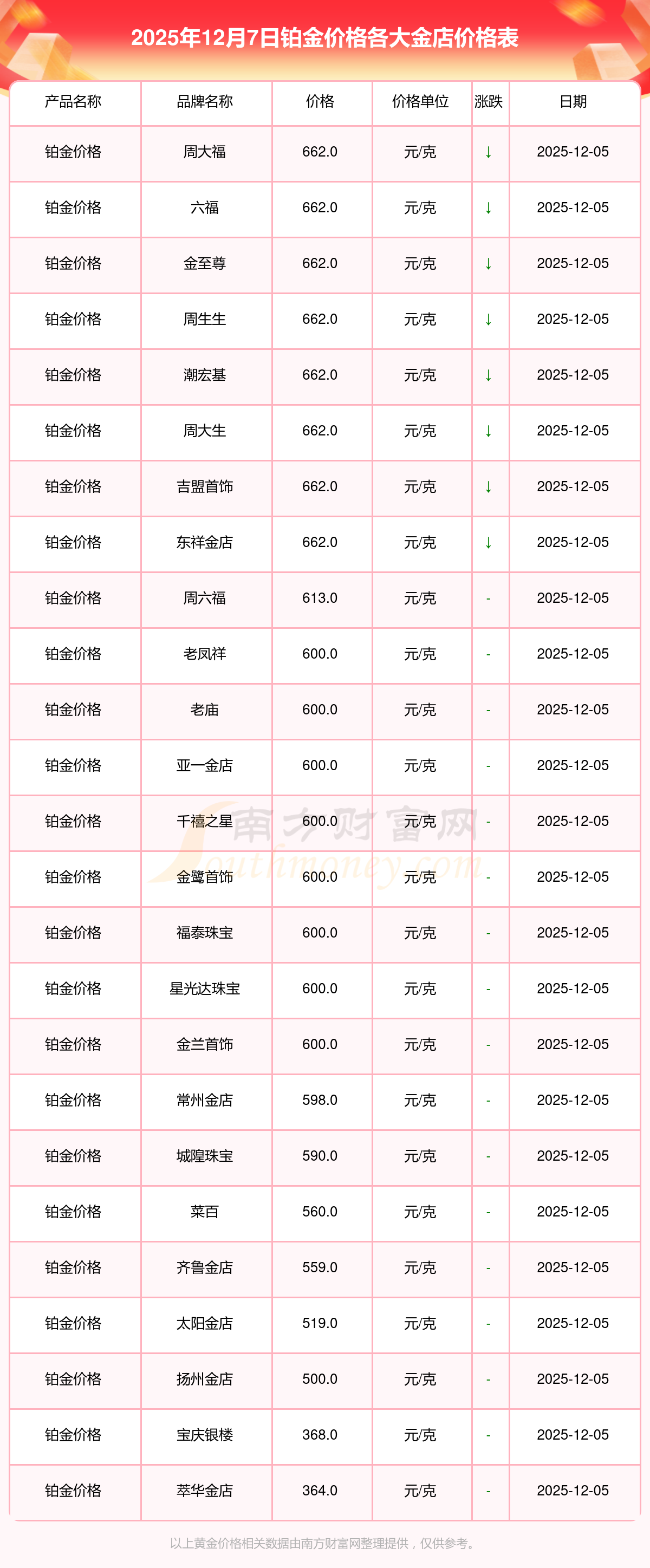 各金店铂金价格一览(2025年12月7日各金店铂金价格最新来了),一起来看看吧!