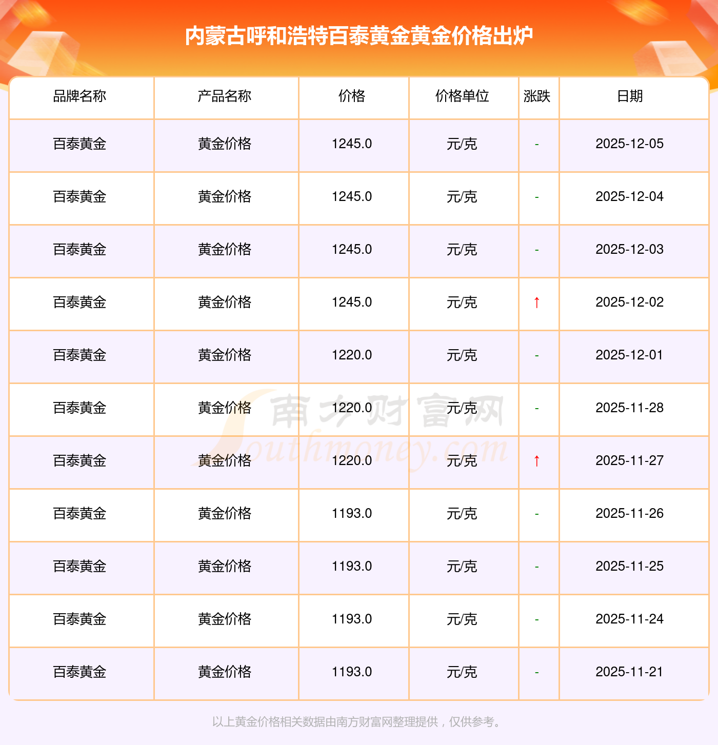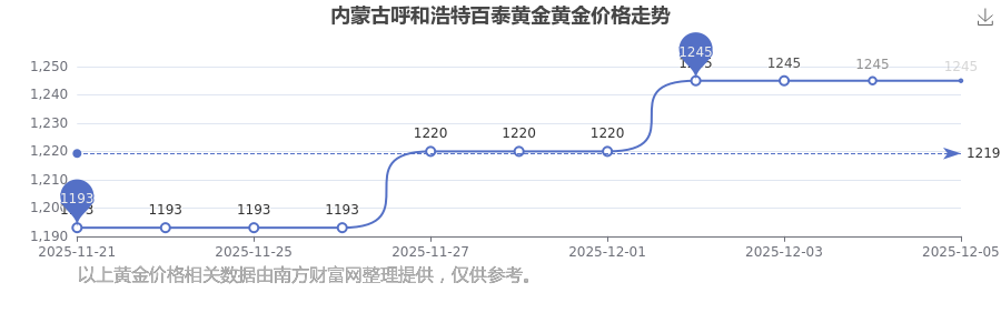 今日(2025年12月7日),内蒙古呼和浩特百泰黄金黄金价格:1245.0元/克。
